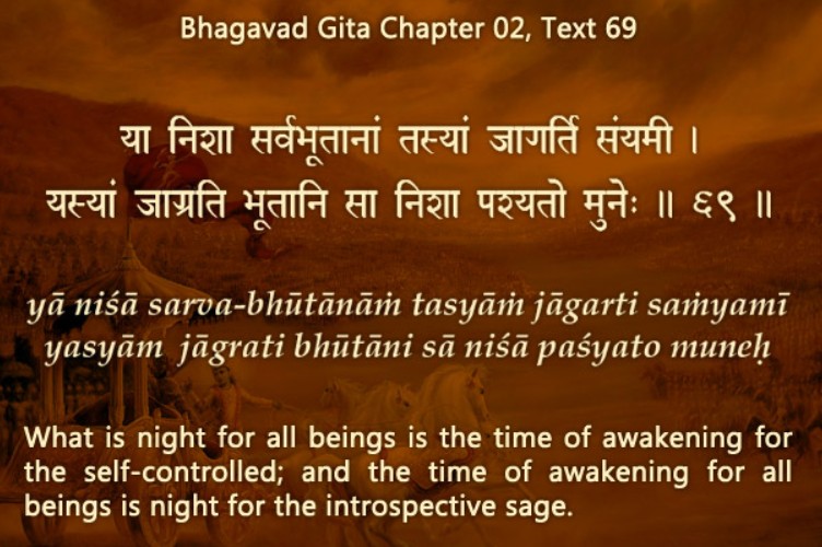 “What is night for all beings is the time of awakening for the self-controlled; and the time of awakening for all beings is night for the introspective sage.”